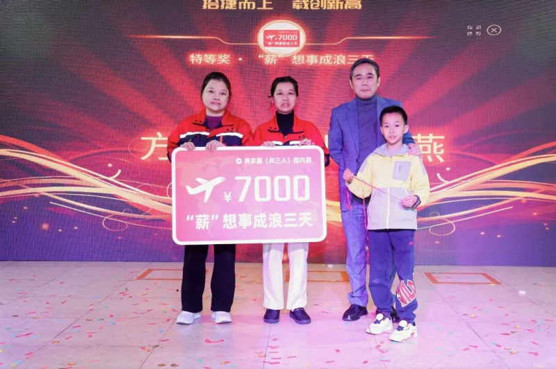 年会的抽奖环节,无疑是全场最令人期待的高潮之一。三等奖的小米行李箱、二等奖的购物卡、一等奖的华为MATE80手机以及重磅的特等奖——三天带薪度假之旅,每一项奖品的揭晓都让全场气氛达到了最高潮。