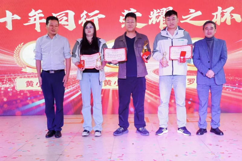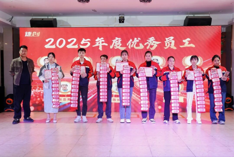 此次年会最为动人的环节,是对十周年员工的表彰——送金条。黄小双、罗斌和黄小安三位员工,十年如一日,始终坚守在捷创的岗位上,见证了公司从初创到成熟的每一步发展。三位获奖者分享了自己与公司同行的心路历程,真挚的情感和充满力量的言辞打动了每一位在场的家人。姚总和李总亲自为他们颁发了纪念奖杯与荣誉证书,感谢他们多年来的辛勤耕耘与坚守。